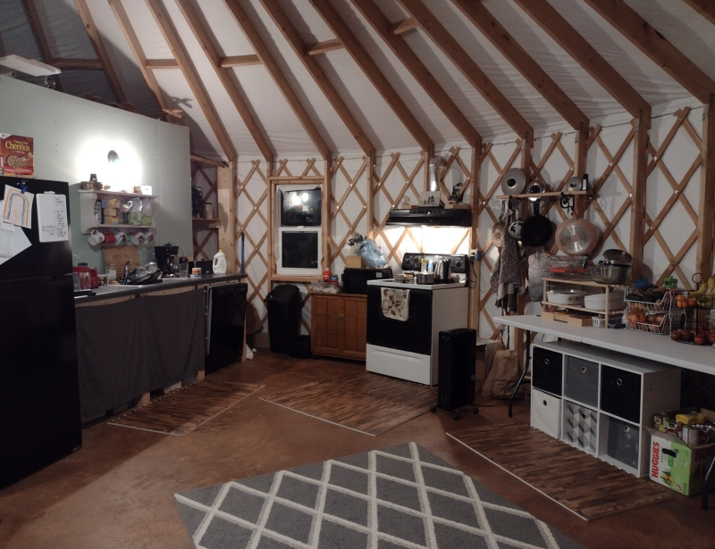 It's a process, but we are slowly settling in. It seems like we've been groomed for this. We've moved so much, and had bigger spaces to work with, as well as, smaller spaces to work with. I'm not sure if it's the circular space, or the fact that we designed the yurts before building, but it feels like this space is far more functional than others! Every single, little space is usable. As you can see, in the picture of our kitchen area, even square things fit nicely around the circle. There was some dead space at the end of the counter, that Matt split in half to make a pantry, in the kitchen, and towel shelves in the bathroom.